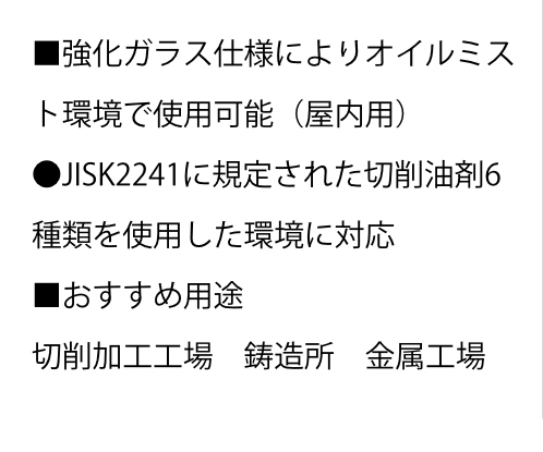 強化ガラス仕様によりオイルミスト環境で使用可能(屋内用)