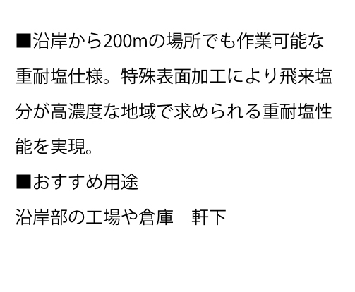 重耐塩性能を実現。海岸から300m以内の重塩害地域での使用におすすめです。