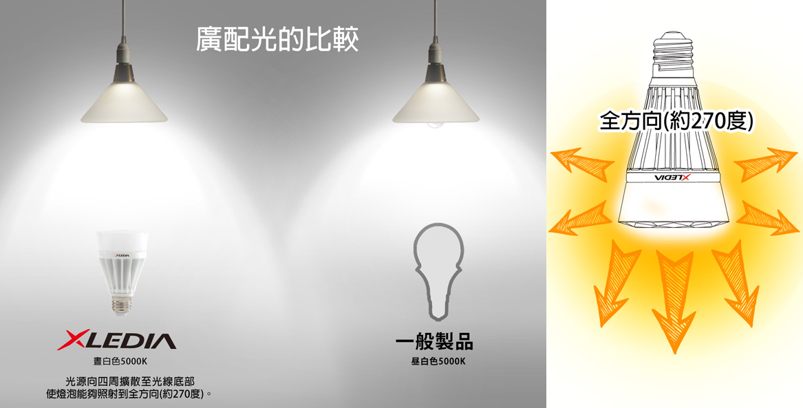 提高配光特性的廣配光,無論從哪個方向看過去亮度都非常地充足。使燈泡能夠照射得更廣。