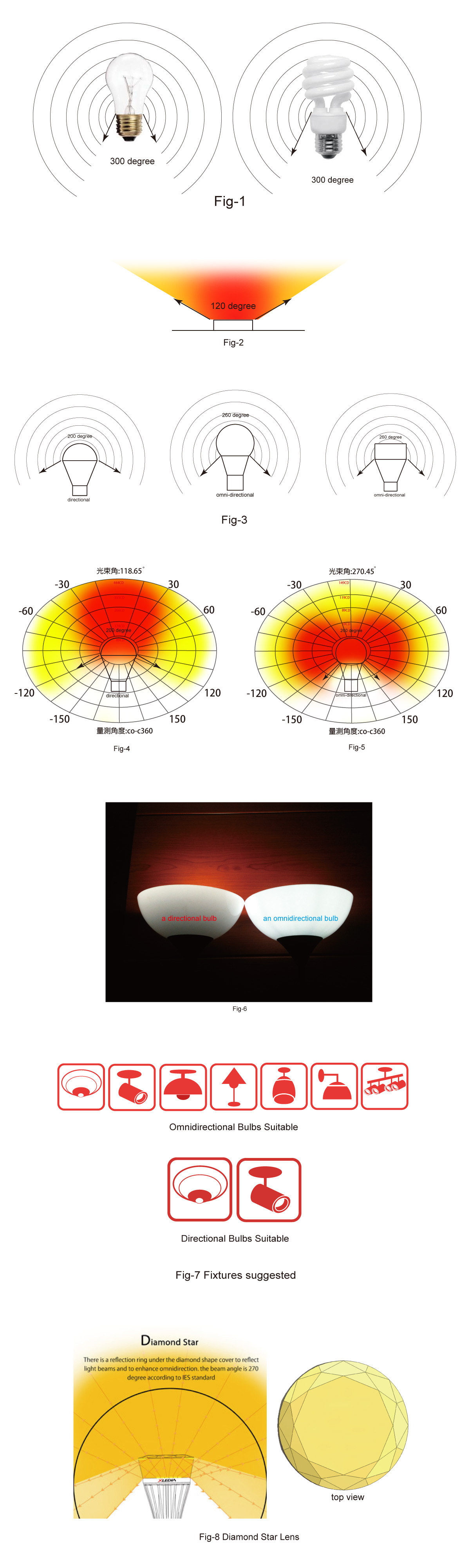 Beam Angle Generally speaking, incandescent bulbs and compact fluorescent bulbs emitted light beams in around 300 degree, shown in Fig-1. We say that their beam angles are omni-directional. When it comes to LED, there are 2 types, directional and omni-directional. LED chip emits light beams in narrow angle, usually 120 degree, as shown in Fig-2. It is not much trouble to design directional LED bulbs. Most of manufactures want customers to feel familiar to buy and to fit into most of existing light fixtures. They made their directional LED bulbs look like incandescent light bulbs. But, it takes more works to design omni-directional LED bulbs due to the nature of LED narrow beam angle. Manufacturers must play some tricks to spread LED’s light beams to wider angle. That’s why you see LED light bulbs in so many different shapes on markets. Here are some examples shown in Fig-3.