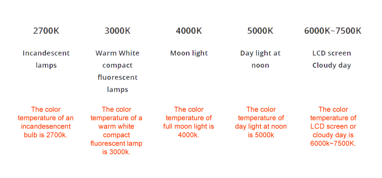 When you exam the lighting facts on the package of the LED bulb you purchased, you can see the item, color temperature. For most of consumers, color temperture means cool white or warm white. Aactually, there are a lot of more. The color temperature of a light source is the temperature of an ideal black-body radiator that radiates light of comparable hue to that of the light source. Color temperature is a characteristic of visible light that has important applications in lighting, photography, videography, publishing, manufacturing, astrophysics, horticulture, and other fields. It is measured in kelvin. This is too tecnical and probably does not make much sense to people. The table A might make it more meaningful to general public.